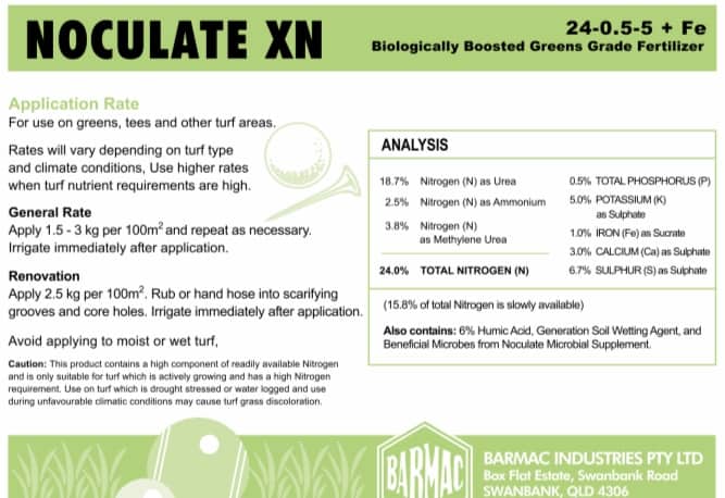 Noculate fertiliser is scientifically designed to address both biological and chemical needs of soil nutrition. Each of the noculate granular products contains high quality nutrition along with humic acid, kelp, soil wetting agent and 24 strains of beneficial microbes all in the one product. The specific high nitrogen blend allows for high turfgrass growth. Ideal as a fertiliser for use at renovation or when rapid growth is required. Added iron enhances plant colour and response.