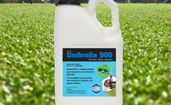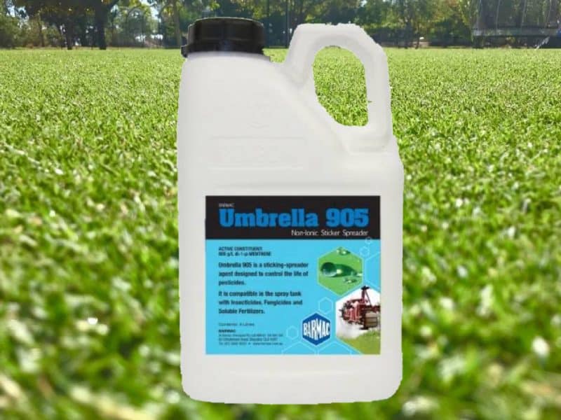 Umbrella 905 is a sticking/spreader agent for use with pesticides. When used as a sticker it will control the life of the pesticide by forming a sticky elastic film that encapsulates and holds the pesticide on the target foliage. When used as a spreader Umbrella 905 helps the pesticide spread out uniformly on hairy or waxy plant parts to help the product get into contact with the target plant. Umbrella 905 dries quickly into a waterproof film and can therefore aid in the rain-fastness of systemic chemicals.